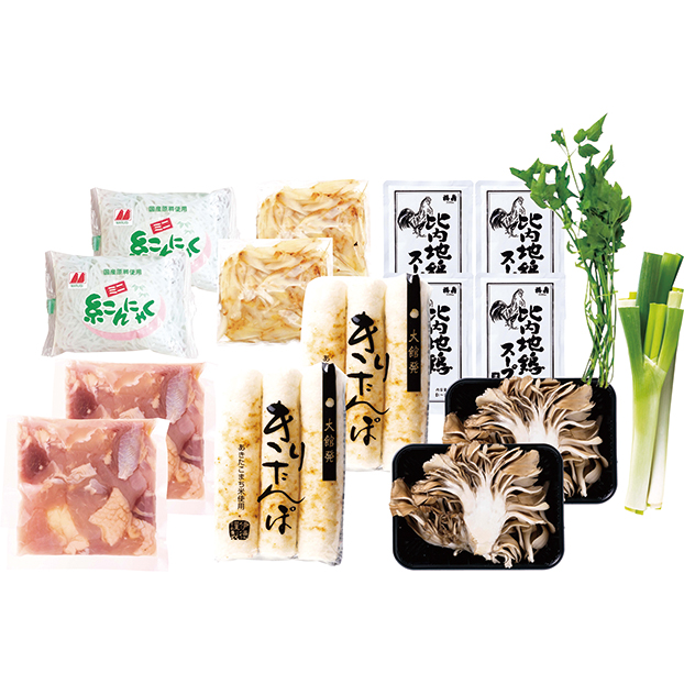 きりたんぽ90g×6、比内地鶏スープ(2倍濃縮タイプ)250g×4、比内地鶏(肉)300g、舞茸200g、セリ120g、長ネギ2本分、ささがきゴボウ200g、糸こんにゃく240g